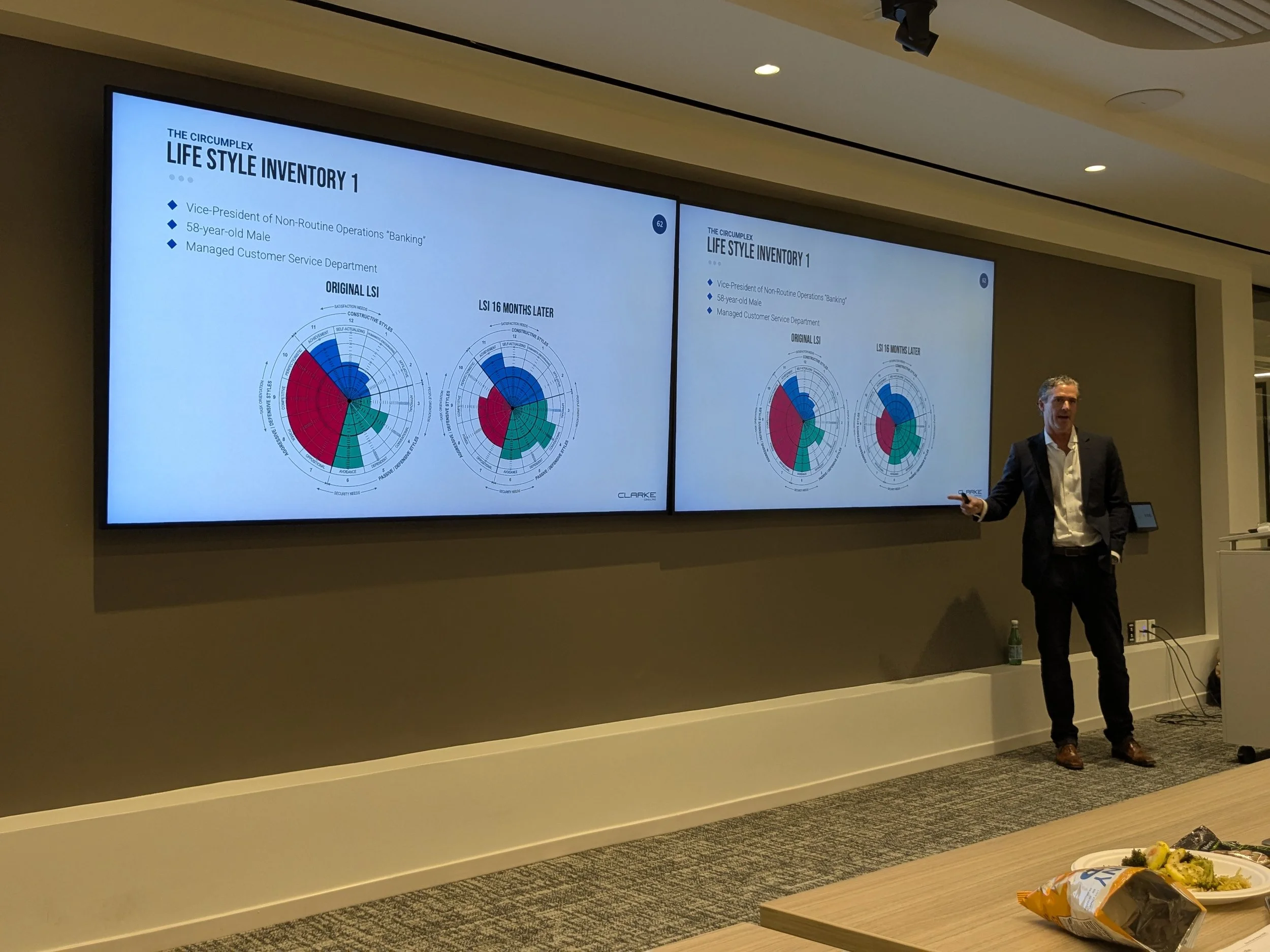 Presentation #1 was led by Cable Clarke, a specialist in organizational dynamics. This presentation focused on the Leadership Inside activity using the Lifestyles Inventory (LSI) assessment. Before the session, participants completed a self-evaluation, and during the presentation Clarke discussed the LSI's purpose, which measures how individuals' thinking patterns influence their behavior, and explained how the LSI results help identifying constructive, passive defensive, and aggressive defensive styles, which impacts organizational culture, leadership effectiveness and team’s performance. The activity helped participants recognize their personal strengths and behavioral tendencies while also identifying areas that may limit their effectiveness as leaders. Clarke emphasized that leadership development begins with self-awareness and that understanding one’s behavior can improve communication, decision-making, and team management. Examples from various companies illustrated how different cultures influence leadership behaviors. Overall, the presentation showed that stronger organizations are built when leaders intentionally reflect on and adjust their own actions and attitudes.